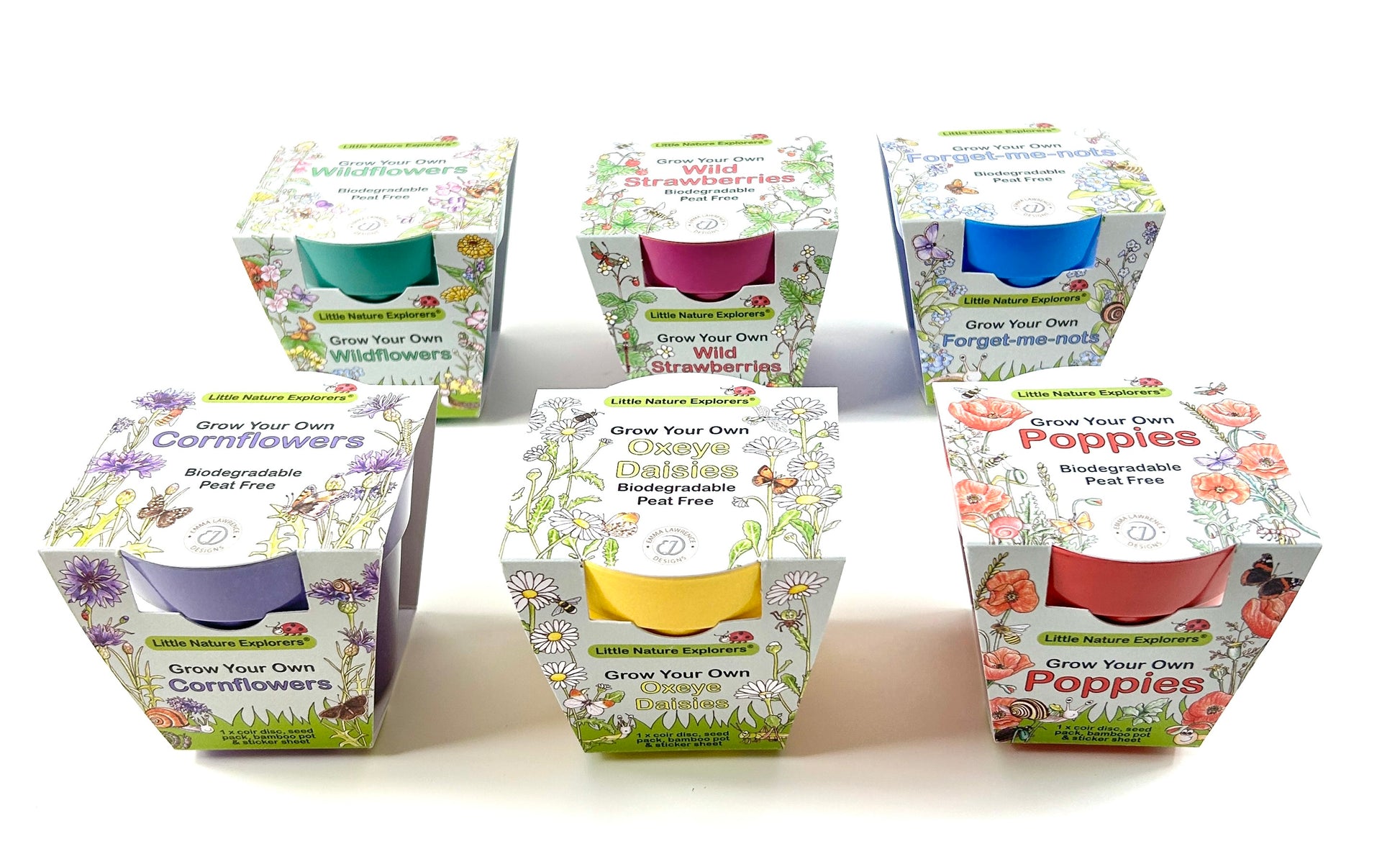 A selection of children's growing kits to grow a range of native British wildflowers. Featuring the charming illustrations of the 'Little Nature Explorers' range by artist Emma Lawrence.